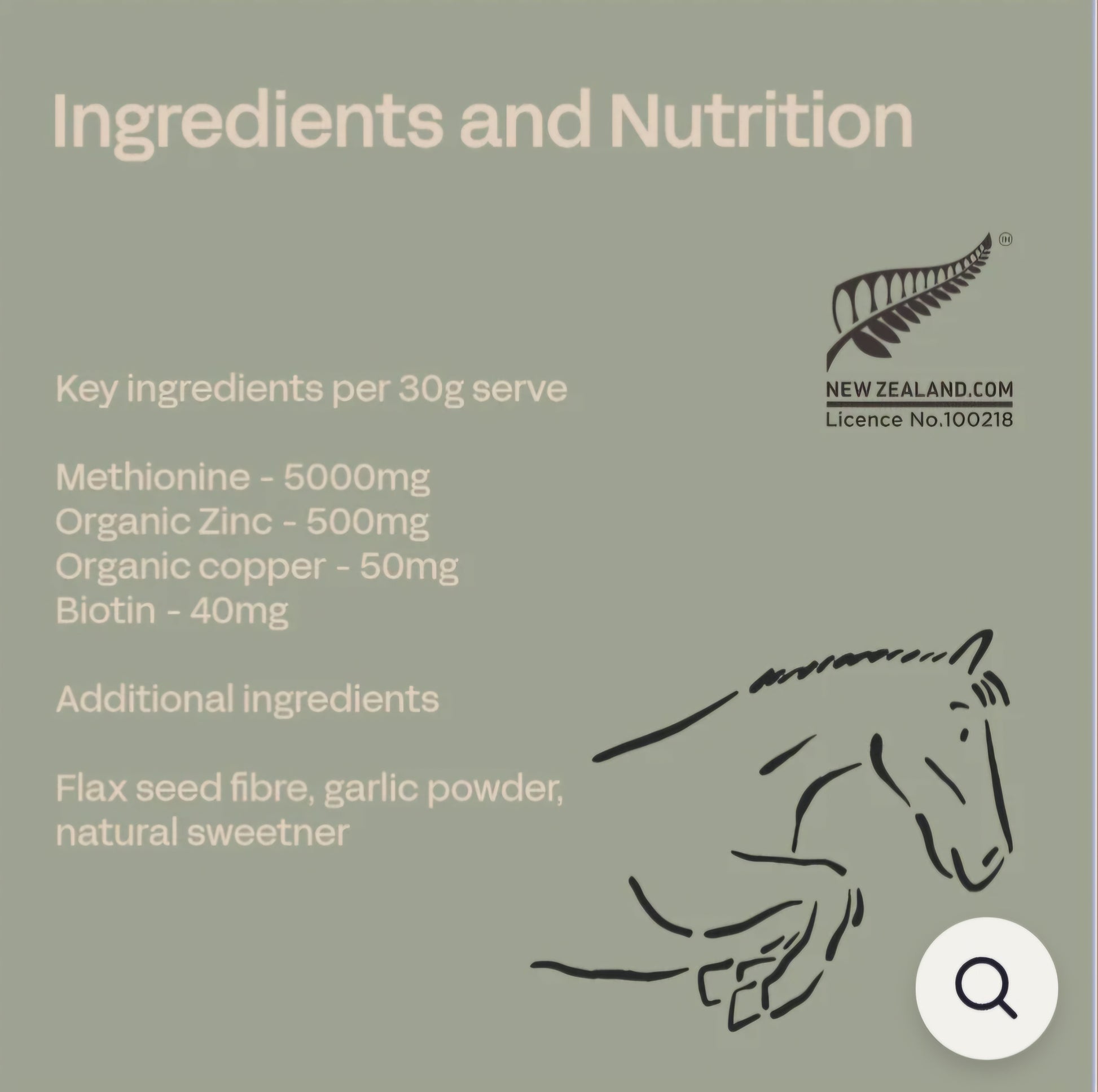 Flax seed fibre, methionine, biotin, organic zinc, organic copper, garlic powder, natural sweetner.