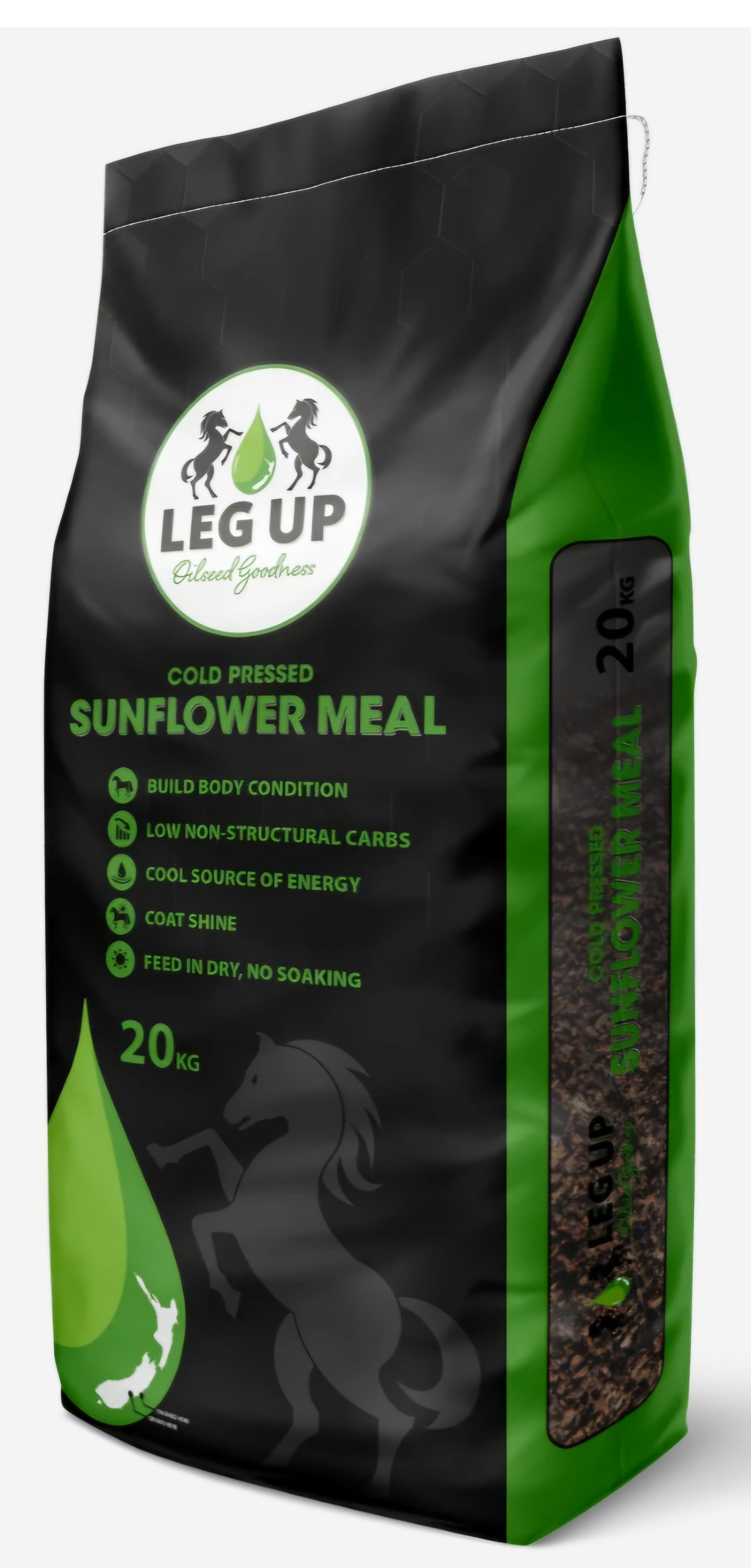 Leg Up Sunflower Meal is derived from New Zealand grown high oleic sunflower seed. A cold pressing process is used to extract the oil from seed without the use of heat or chemicals. This gentle process ensures all nutritional benefits are retained (protein and oil) in the meal and are available for your horse to utilise