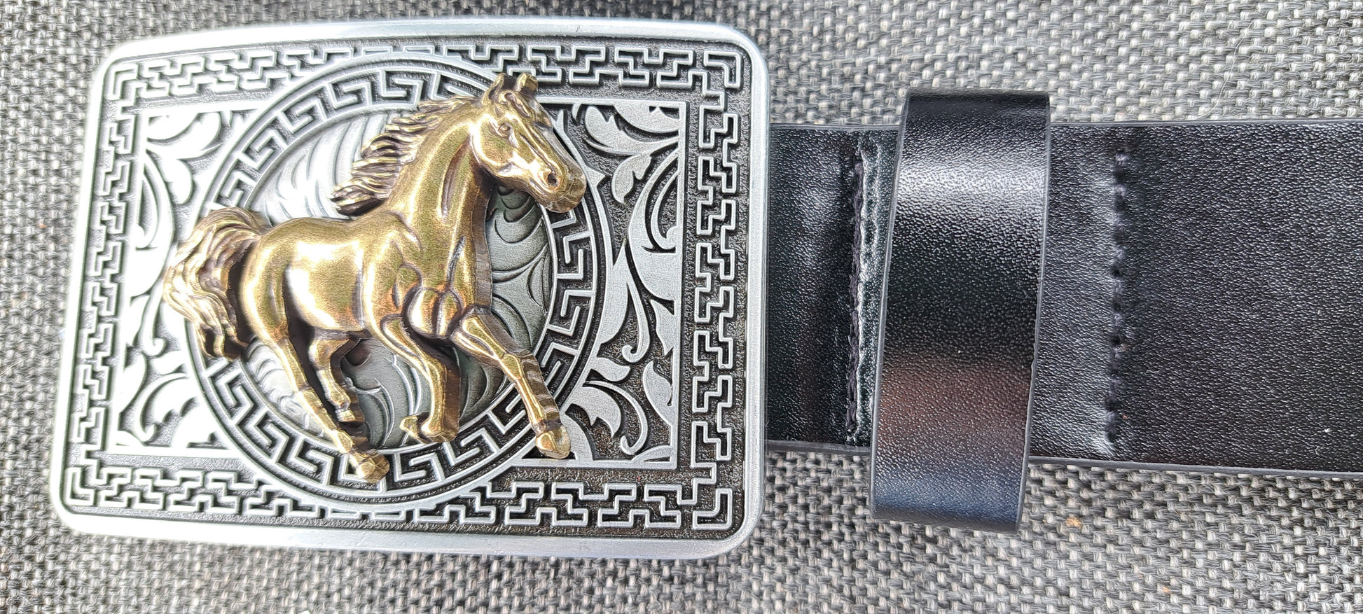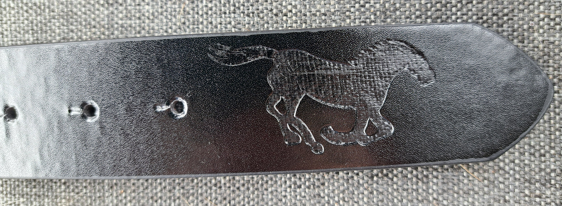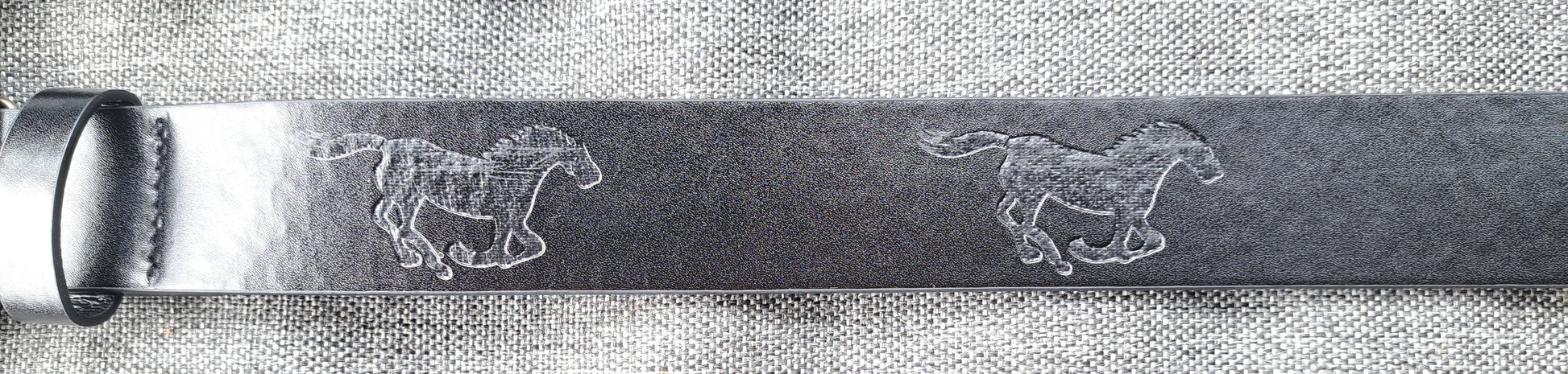 The really cute buckle is the hero of this one! The three dimensional running horse is complimented by a running horse design also stamped along the belt.